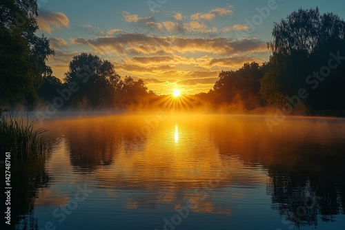 Obraz premium Golden sunrise reflected beautifully over serene misty waters and trees