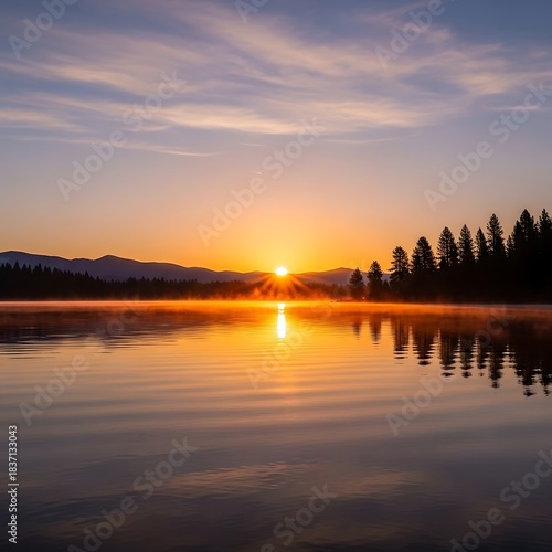 © Nur, Fototapeta premium Golden Sunrise Reflections on Serene Lake Water.