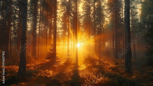 © budi, Fototapeta premium Golden Sunrise Through a Dense Pine Forest