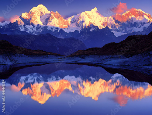 © JADE, Obraz premium Golden Sunrise: Tranquil Lake Nestled by Snow-Capped Mountains
