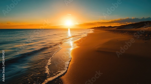 Fototapeta premium Golden sunset casting long shadows over a serene beach, with the sky...
