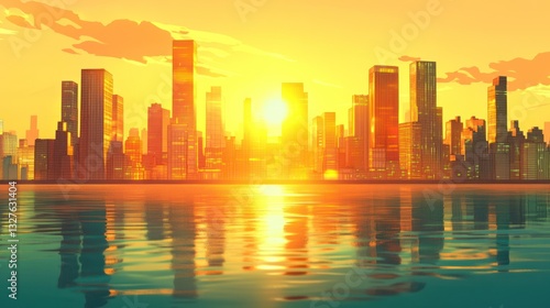 © Berkah1789, Fototapeta premium Golden Sunset Cityscape Over Calm Water Reflection