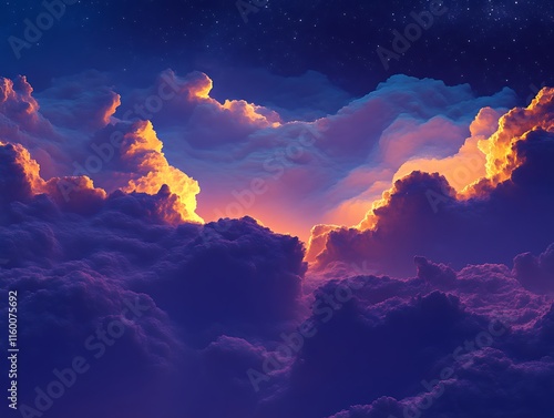© lisa, Fototapeta premium Golden Sunset Cloudscape Above Night Sky Stars