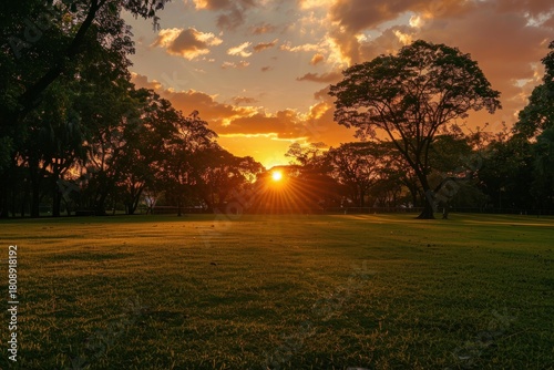 © nsit0108, Naklejka premium Golden sunset creating starburst effect over trees and green meadow
