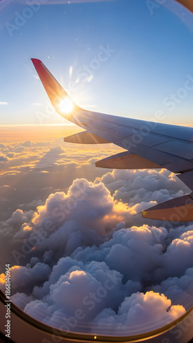 © Ofida Studio, Obraz premium Golden Sunset Flight: Airplane Wing Over Majestic Clouds