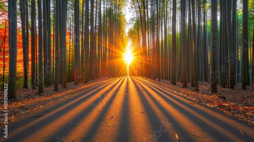 Fototapeta premium Golden sunset illuminates bamboo forest path nature scene tranquil environment serene viewpoint peaceful concept for relaxation