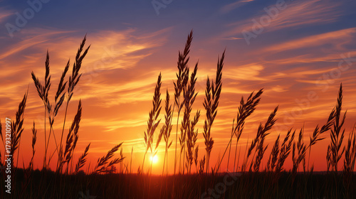© MasTPX, Fototapeta premium Golden sunset illuminates the silhouette of tall grass swaying gently in the breeze, creating a peaceful and serene natural landscape at dusk in the countryside.