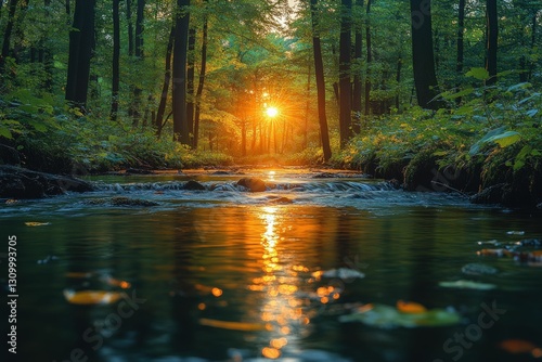 © Ali, Obraz premium Golden sunset illuminates tranquil forest stream