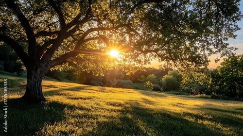 Naklejka premium Golden Sunset Illuminating a Peaceful Green Landscape with Tree : Generative AI