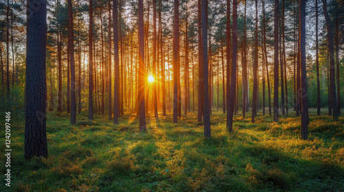 Obraz premium Golden sunset illuminating tranquil pine forest