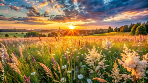© Tima, Fototapeta premium Golden sunset illuminating wildflower meadow in the countryside