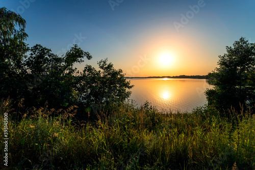 Obraz premium Golden sunset on the lake in Russia. Landscape summer.