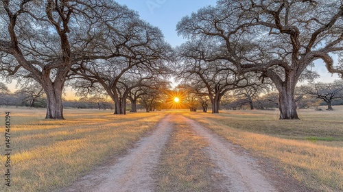 © RizalAziz, Fototapeta premium Golden Sunset over a Country Road Lined with Trees and a Grassy Field