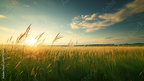 Fototapeta premium Golden sunset over a field of tall grass.