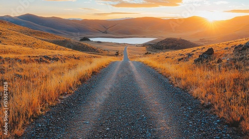 Naklejka premium Golden sunset over a mountain road. A gravel road stretches into the distance, leading to a tranquil lake, bathed in warm golden light. Rolling hills covered in autumnal grasses surround the scene