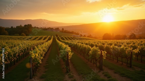 Fototapeta premium Golden Sunset Over a Picturesque Vineyard