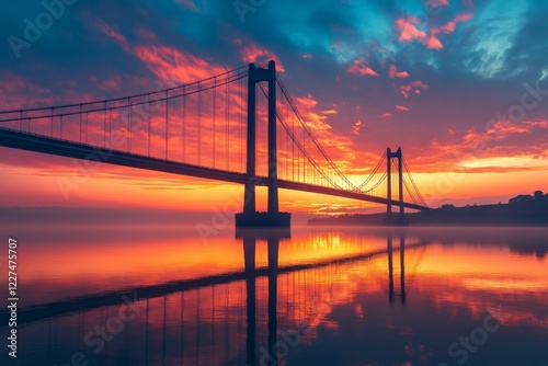 © Andrii Savchuk, Obraz premium Golden sunset over a suspension bridge reflected in calm water
