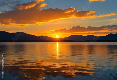 Fototapeta premium Golden sunset over a tranquil lake, with mountains silhouetted against a...
