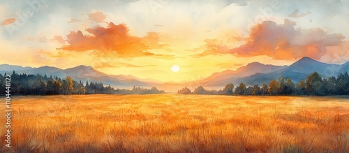 © Almahyra, Obraz premium Golden sunset over a vast field with mountains in the background.