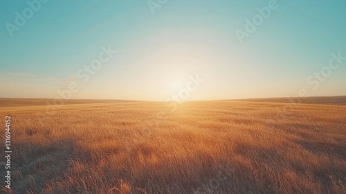 © harryaishi, Obraz premium Golden sunset over a vast, flat grassland.