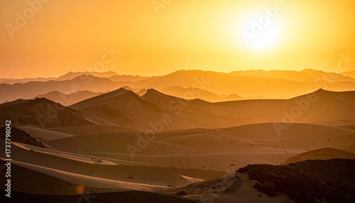 © Liopi, Fototapeta premium Golden Sunset Over Arid Mountain Range with Warm Tones and Pixelated Texture in Horizontal Composition, Creating a Scenic and Abstract Landscape View