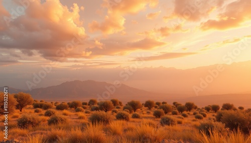 Obraz premium Golden Sunset Over Desert Landscape With Rolling Hills