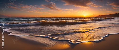 Naklejka premium Golden Sunset Over Gentle Ocean Waves on Tranquil Beach