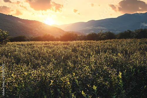 © Nondo, Obraz premium Golden sunset over lush berry field high resolution picture