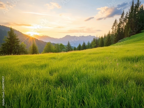 Obraz premium Golden sunset over lush green fields and distant mountains in a tranquil...
