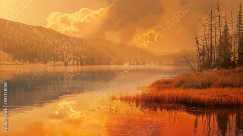 © benjamas, Fototapeta premium Golden Sunset Over Mountain Lake.