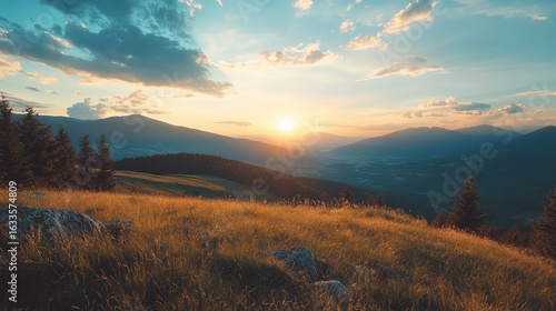 © Pertama, Fototapeta premium Golden sunset over mountain landscape