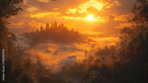 © Biplob, Naklejka premium Golden Sunset Over Mystical City In Tropical Landscape Photo