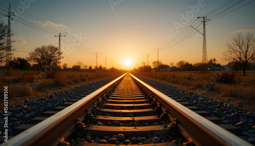 Obraz premium Golden Sunset Over Parallel Railway Tracks – Symmetrical Perspective...