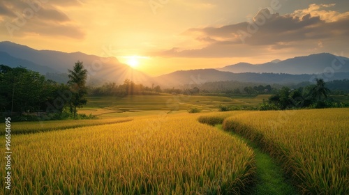 Obraz premium Golden Sunset Over Rice Paddy Fields
