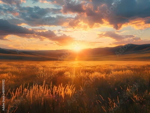 Obraz premium Golden Sunset Over Rolling Hills and Wildflowers Ai generated