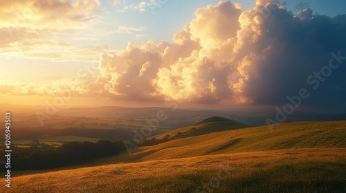 Obraz premium Golden sunset over rolling hills, dramatic clouds, rural valley backdrop,...