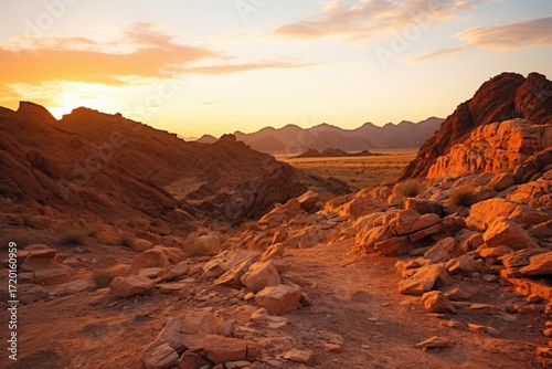 Fototapeta premium Golden sunset over rugged desert mountains and rocky terrain orange yellow