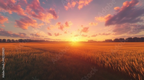 Obraz premium Golden sunset over serene grassy field.