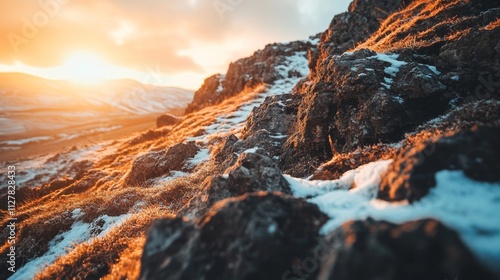 Naklejka premium Golden Sunset Over Snowy Rocky Hillside