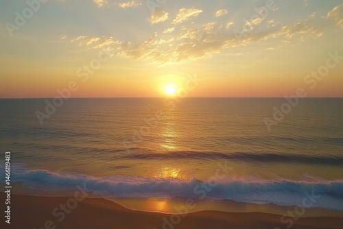 © hits, Naklejka premium Golden sunset over the ocean. Gentle waves crash on a sandy shore