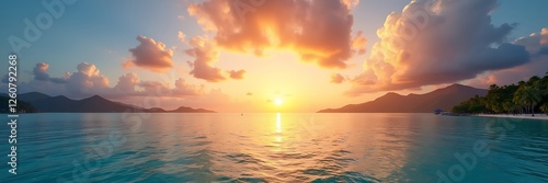 © Naiem, Obraz premium Golden Sunset Over Tranquil Sea with Distant Islands ,Breathtaking Landscape