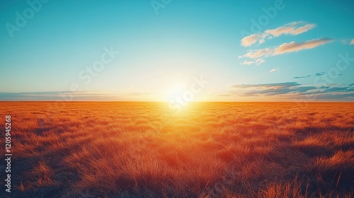 © AGUNG, Obraz premium Golden sunset over vast prairie field, cloudy sky background, desktop wallpaper