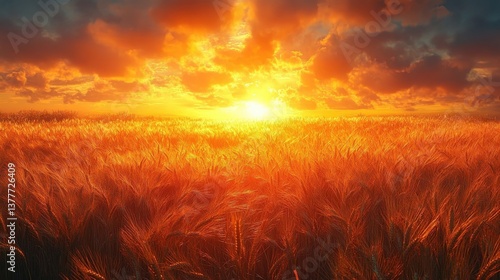 Fototapeta premium Golden Sunset Over Wheat Field Illuminating Dramatic Sky