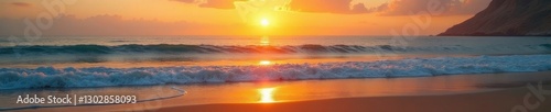 Naklejka premium Golden sunset paints calm ocean waves on sandy shore , peaceful, summer