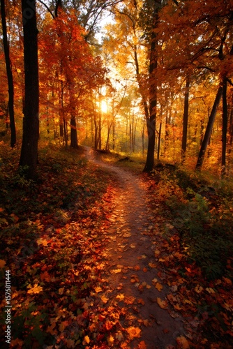 © ArtPixel-Portfolio, Obraz premium Golden sunset rays filtering through autumn woodland, casting warm light on leaf strewn forest trail