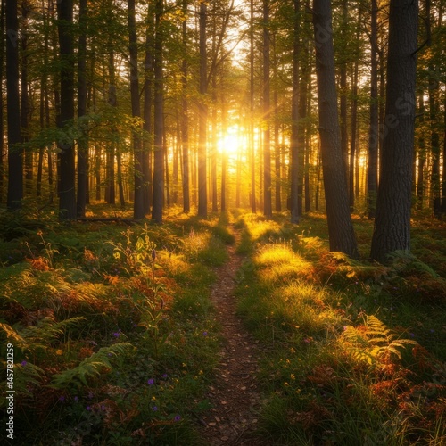 Obraz premium Golden Sunset Rays in Autumn Forest Path