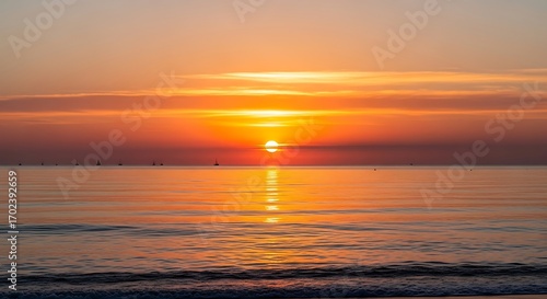 © Salman, Naklejka premium Golden Sunset Reflecting on a Calm Ocean Horizon.