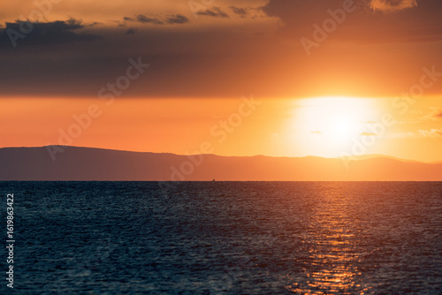 © EdNurg, Naklejka premium Golden sunset reflecting on calm sea with distant mountains and clouds creating a dramatic and peaceful atmosphere