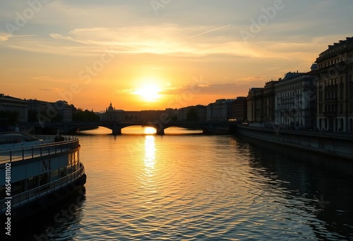© Tanapong, Naklejka premium Golden sunset reflecting on Naviglio Grande's calm waters, Milan, Italy, Milan