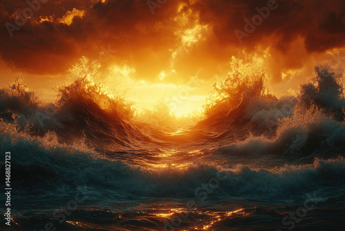 © Nastassia, Obraz premium Golden Sunset Reflecting on Ocean Waves with Mist Rising